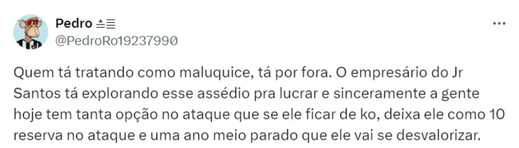 Vale lembrar que, após a divulgação das informações sobre a oferta cruzeirense, Textor tratou como ‘incrivelmente falsa’. Porém, Júnior Santos e seu staff estão decididos a não renovar com o Botafogo se a proposta salarial não melhorar.