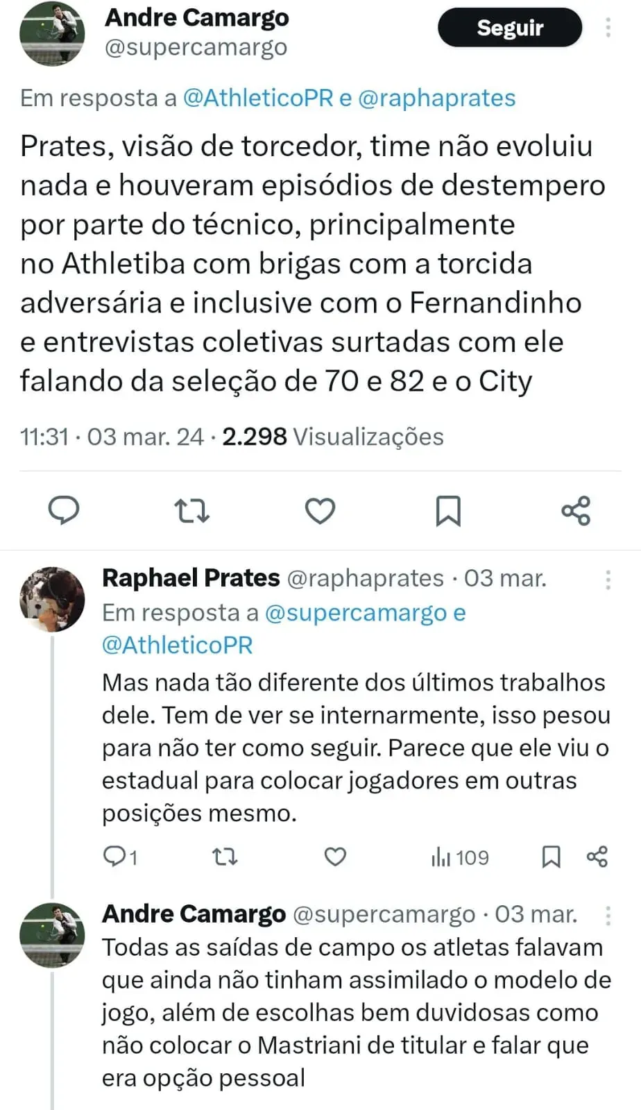 Ele afirmou que deveria ter avaliado melhor o planejamento antes de aceitar a proposta da equipe paranaense. “Fui responsável por ter dito que sim, por ter visto a folha de pagamento e não ter percebido isso. Me disseram que eram dois canhotos muito bons, mas estavam lesionados, nunca conseguimos levá-los em conta. A decisão é minha, mas cumpri todos os objetivos”.