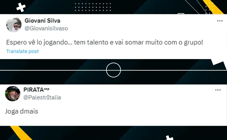Sobre essa ‘volta’ do meia, a torcida palmeirense mandou os seguintes recados ao atleta. “Espero vê lo jogando… tem talento e vai somar muito com o grupo!”. “Esse joga muito bem, tem tudo para ser o reserva imediatado do Raphael Veiga”.