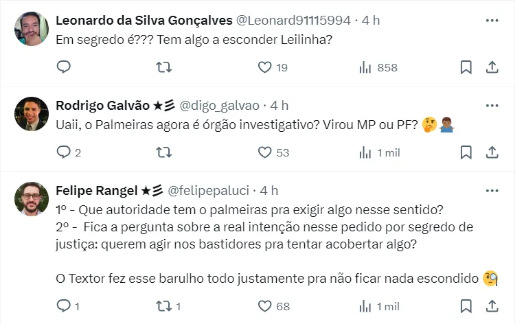Os advogados do Alviverde argumentam que as declarações de Textor colocam em dúvida a integridade das competições organizadas pela Confederação Brasileira de Futebol, especialmente o Campeonato Brasileiro, e prejudicam a reputação do Palmeiras.