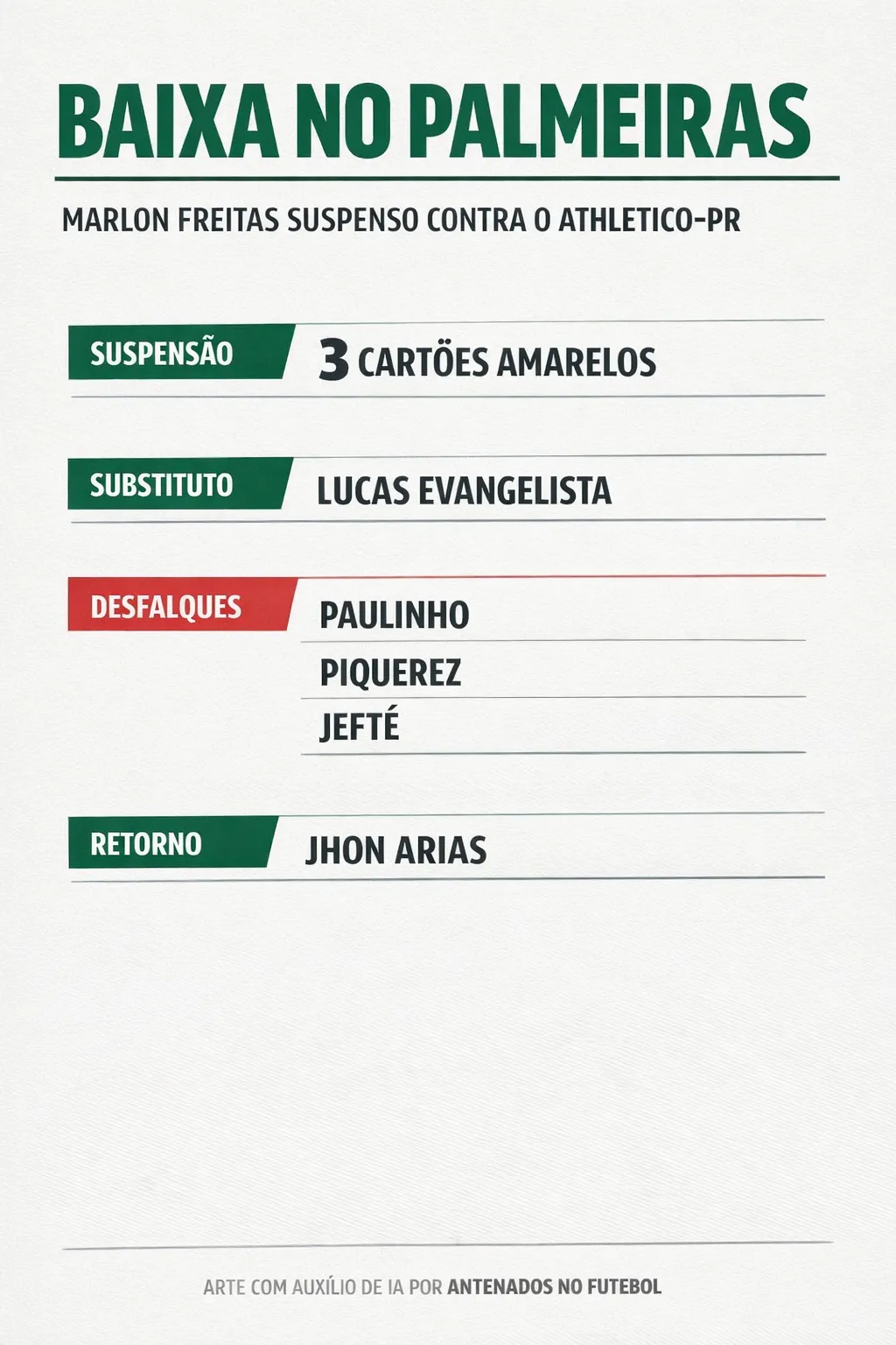 Em um duelo em que o Athletico-PR tende a explorar transições rápidas e avanços pelos lados, a falta do volante pode expor mais os espaços deixados por Giay e Arthur, elevando a responsabilidade do setor defensivo alviverde.