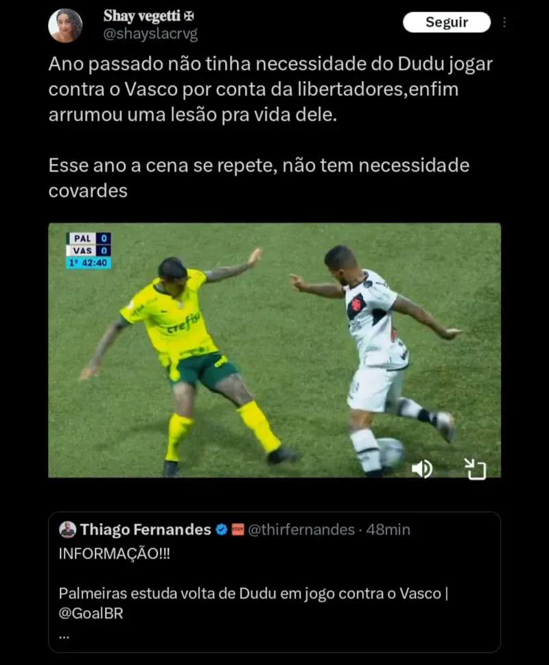 Diante da saída de Endrick, que se despediu do time nesta quinta-feira (29), agora, o Verdão planeja o retorno de Dudu para jogar contra o Gigante da Colina. A informação foi dada pelo portal GOAL.
