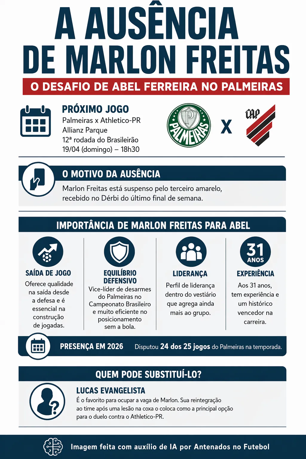 Marlon Freitas é desfalque certo para o técnico Abel Ferreira neste domingo. O volante está suspenso pelo terceiro amarelo, recebido no Dérbi do último final de semana. A ausência do meio-campista traz um grande desafio para Abel.