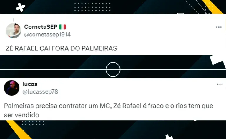 Ainda citando o péssimo resultado, além da pressão contra Rony, Richard Río e cia, outro jogador virou alvo dos torcedores nas redes sociais: trata-se de Zé Rafael. Após mais uma partida de baixo nível, ele recebeu os seguintes recados dos adeptos (SIC).