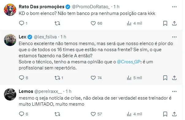 Neste segunda-feira (3), de acordo com o jornalista Samir Carvalho, pessoas dentro do clube paulista estão insatisfeitas com o trabalho de António Oliveira. Elas dizem que o Corinthians tem um bom elenco, mas que o técnico português apresenta apenas um estilo de jogo para a equipe.