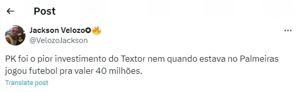 Sendo assim, os seguintes comentários contra o jogador estão bombando na web (SIC). “Nossa equipe só não venceu por mais porque o Patrick de Paula é um peso morto que acabou com nosso meio durante 60 minutos”. “Ele está fora de ritmo, não pode ser titular”.