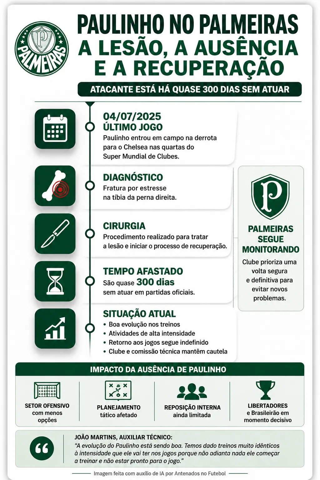 Nesta manhã de segunda-feira (27), o assunto no Palmeiras segue sendo a situação de Paulinho. Depois de cirurgia para tratar uma fratura por estresse na tíbia da perna direita, o atacante segue sem data de retorno aos jogos do Verdão.