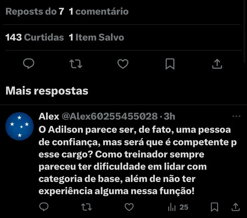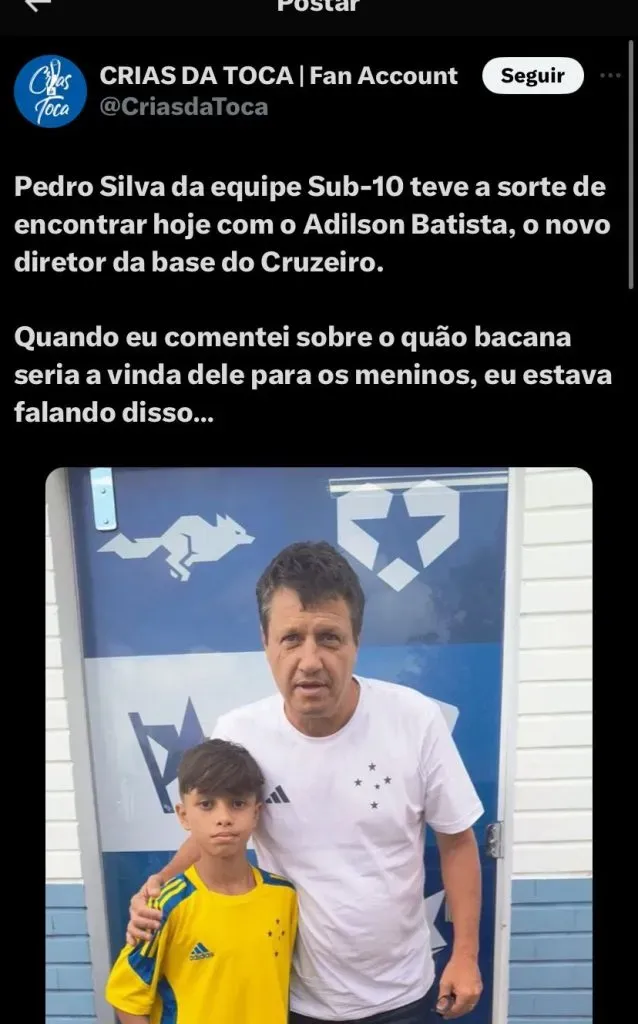 Segundo Pedrinho, o retorno de Adilson é para que o Clube tenha mais jogadores como Vitor Roque e Estevão como seus crias: “ Ele vai ser o homem do futebol de base. Ele vai cuidar da base do Cruzeiro, integrado com o Alexandre, que vai ser responsável pelo futebol todo. Tenho muita confiança no Adilson, e estou trazendo para a gente ter segurança e não acontecer o que aconteceu, de tirar nossos meninos e levar”, iniciou;