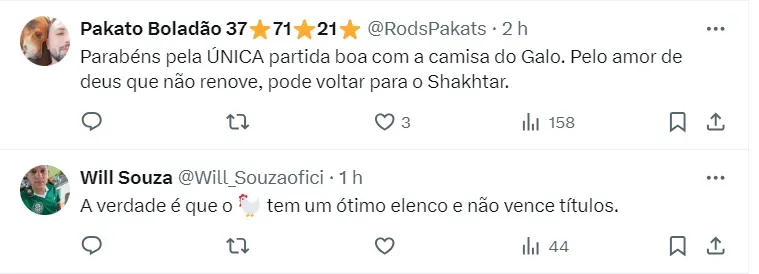 Porém, a situação parece complexa. Uma fonte importante dentro do Galo revelou ao portal No Ataque que a permanência do atleta é improvável, uma vez que o Shakhtar já solicitou seu retorno e não há previsão de extensão do contrato de empréstimo. “O Shakhtar já solicitou o retorno do atleta. Não há previsão de extensão de contrato,” disse a fonte.