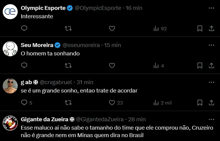 “Seria um sonho ter o Gabigol, mas o Flamengo não liberaria assim, a gente não sabe a condição. Nós nunca cogitamos isso. Mas a gente sonha alto, temos que fazer um time à altura da torcida”, disse.