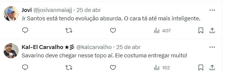 “O Júnior Santos tem um programa de treino complementar de prevenção de lesões e condicionamento físico, que é alinhado com o Botafogo. O objetivo é potencializar as suas capacidades, recuperá-lo logo após as partidas para que ele possa suportar a sequência de jogos em alto nível”, disse.