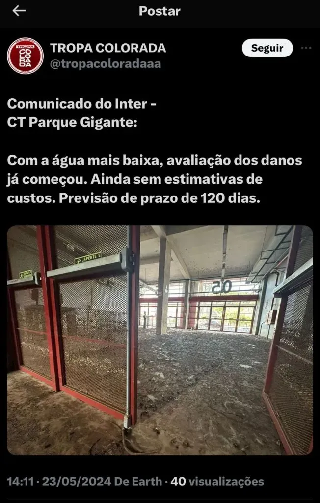 Nesta quinta-feira (23), o Clube informou que precisará de ao menos quatro meses para recuperar o CT Parque Gigante, que segue alagado por conta do alto nível do Rio Guaíba. Em relação ao Beira-Rio, o Inter informou que a dependência segue sem água e sem luz. No entanto, a grama começará a ser replantada na próxima semana.