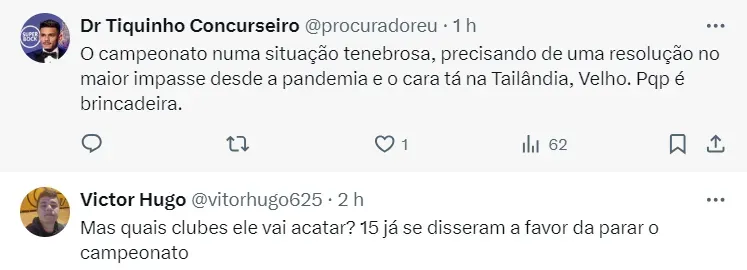“Depois de colocar todos esses pontos para que eles definam, não tenho como ficar contrário (aos clubes) porque nossa gestão é democrática. Vamos mostrar o contraditório dessa paralisação, mas vamos respeitar a decisão dos clubes”, continuou.