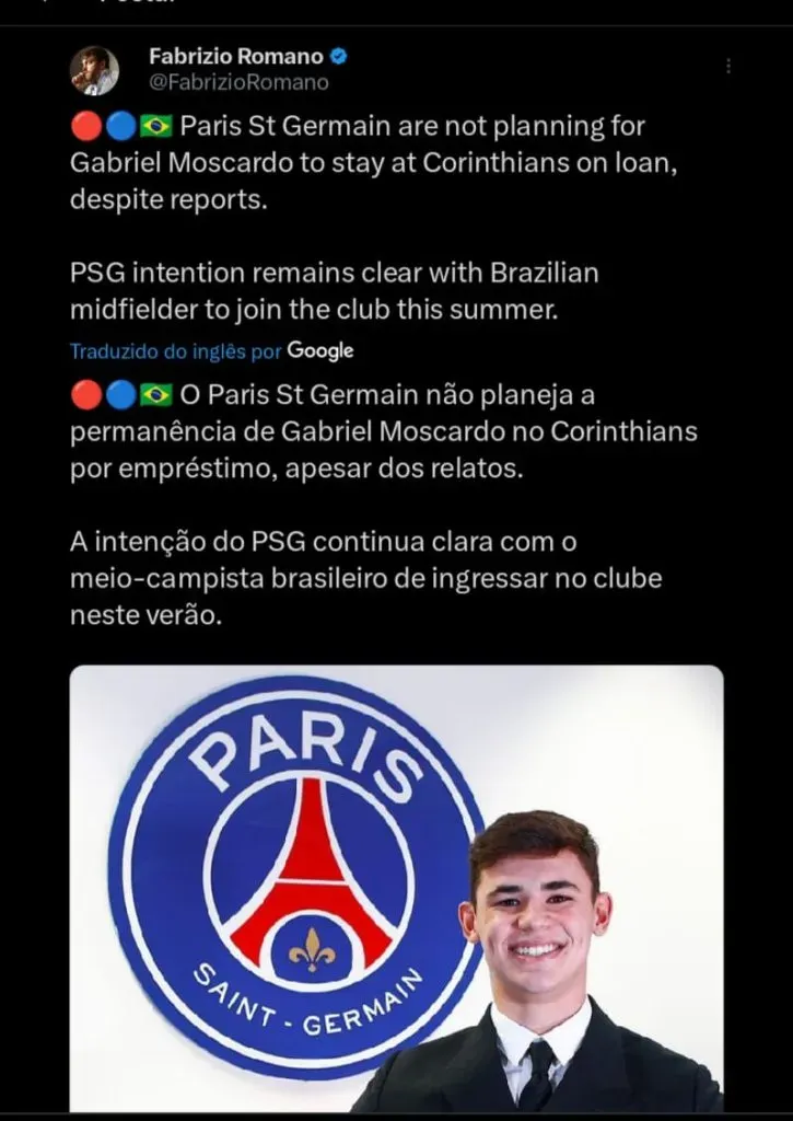 Ainda de acordo com Fabrizio Romano, o Paris Saint-Germain mantém a intenção de ter o jovem meio-campista brasileiro Gabriel Moscardo. Ou seja, ainda neste verão europeu, Moscardo irá para a França e viverá seus últimos dias no Parque São Jorge.