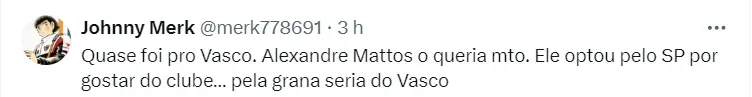 “Contratado no meio do Campeonato Português, enquanto era artilheiro do Vitória de Guimarães, que disputava vaga na Liga Europa. Veio para ser reserva de Calleri e será titular em todas as posições do ataque, além de reserva do centroavante argentino”, acrescentou.