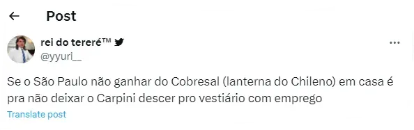 “Se o São Paulo ganhar de 2 a 0 jogando mal, o Carpini não fica. Vai ter um debate grave dentro do clube, o Rui Costa e o Belmonte vão tentar o fico dele, e o Julio Casares vai olhar a reação da torcida na arquibancada e na rede social, aí vai ser muito difícil de sustentar”, frisou.