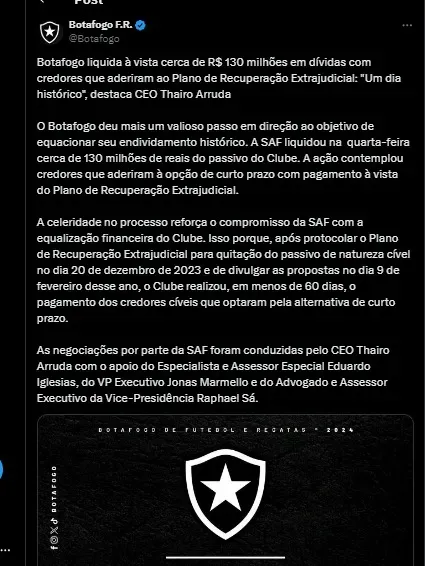A novidade foi informada pelas redes sociais do Clube e também comemorada pelo CEO, Thairo Arruda: “”Hoje é um dia histórico para o Botafogo e que reafirma o compromisso assumido pelo John Textor com os alvinegros quando escolheu fazer parte da Família Botafogo. Realizamos o pagamento de acordos com antigos credores que totalizam cerca de 130 milhões de reais do passivo do Clube Social”, iniciou.