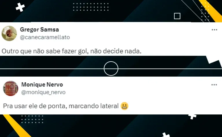 Ainda citando o gringo, a torcida está brava com seu desempenho no Sul (SIC). “Jogamos dinheiro fora com esse cara”. “Ele vem muito mal, acredito que não foi um investimento muito legal do Alessandro Barcellos”. “Espero que ele melhore, caso contrário, precisa ser negociado”.