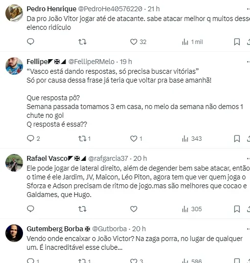 “João Victor e Adson são jogadores importantíssimos. Estávamos vendo onde encaixar o João Victor, ele poderia ter jogado contra o Fortaleza. Adson entrou muito bem. Vasco está dando resposta. Precisa buscar as vitórias”, disse o comandante.