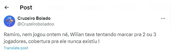 “Ramiro, nem jogou ontem né, Wiliam estava tentando marcar pra 2 ou 3 jogadores, cobertura nunca existiu!”. “Esse aí é um a menos em campo, vive uma fase horrível”. “O cara está de sacanagem, nem vontade teve no clássico contra os caras”.
