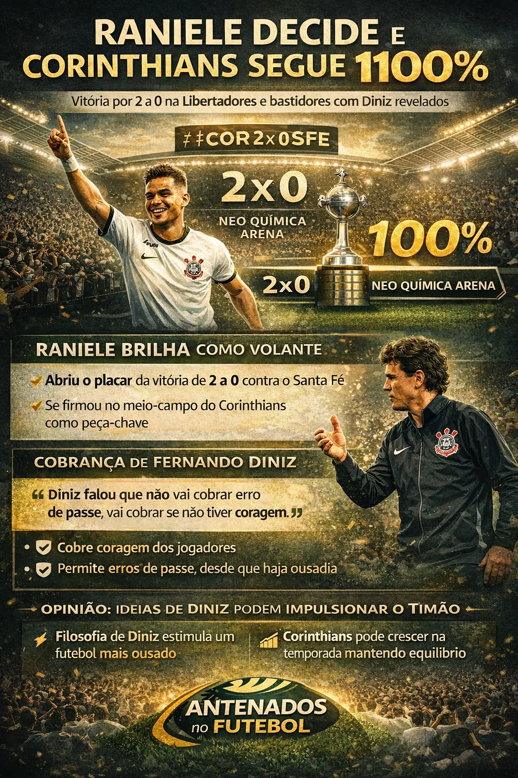O Corinthians manteve os 100% de aproveitamento na Copa Libertadores da América ao vencer o Santa Fé por 2 a 0, na Neo Química Arena. Autor do gol que abriu o caminho para o triunfo, Raniele revelou o tom das cobranças de Fernando Diniz no vestiário, destacando que o treinador prioriza a coragem para jogar, mesmo diante de possíveis erros de passe.