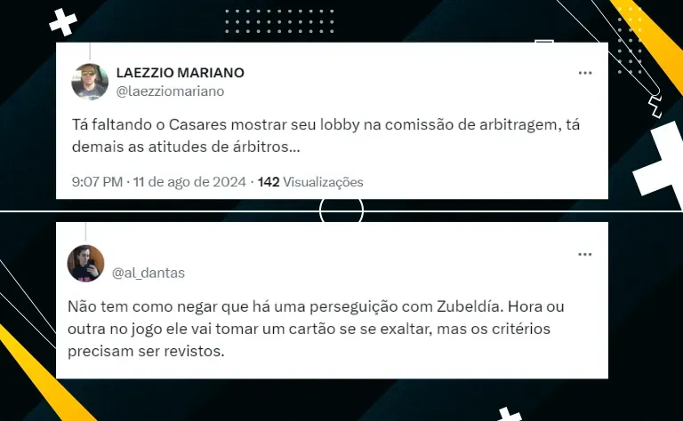 “Em uma falta do lado oposto do campo, ele atravessou o campo para dar cartão para o Zubeldia, ninguém entendeu nada, eu fiquei sem entender, não vi o que realmente ele fez. Mas é bola para frente, a gente sabe que ele é um cara intenso, é um cara que vive futebol, os caras têm que entender a forma dele também de trabalhar”, concluiu.