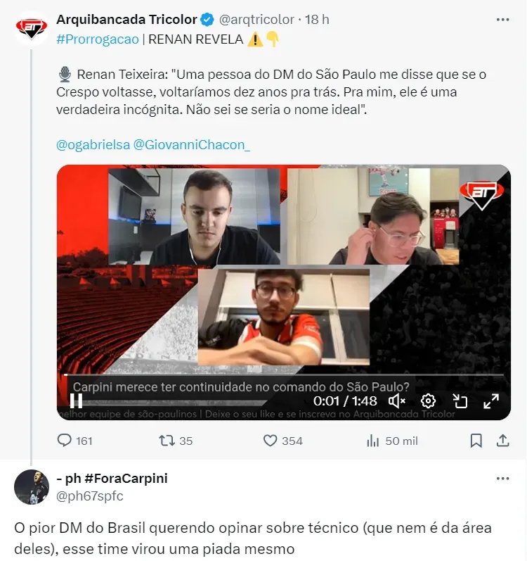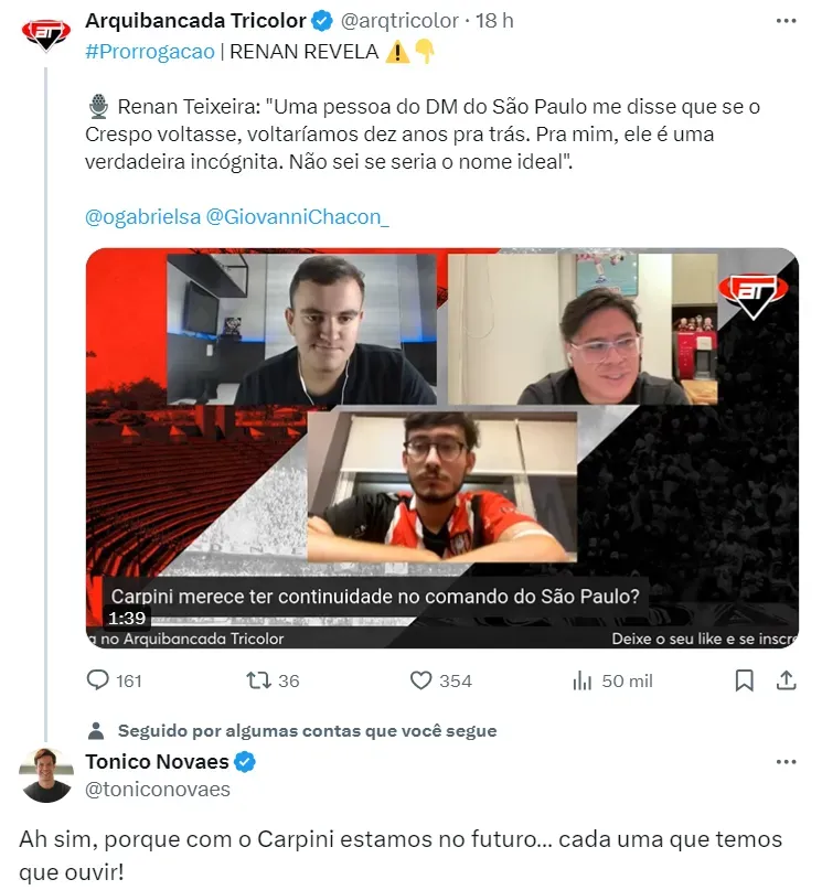 Na manhã desta sexta-feira (12), o jornalista Jorge Nicola trouxe a informação de que Crespo toparia retornar ao Morumbis, mas fato é que Carpini ainda segue no comando e tem respaldo de todos os jogadores do elenco.