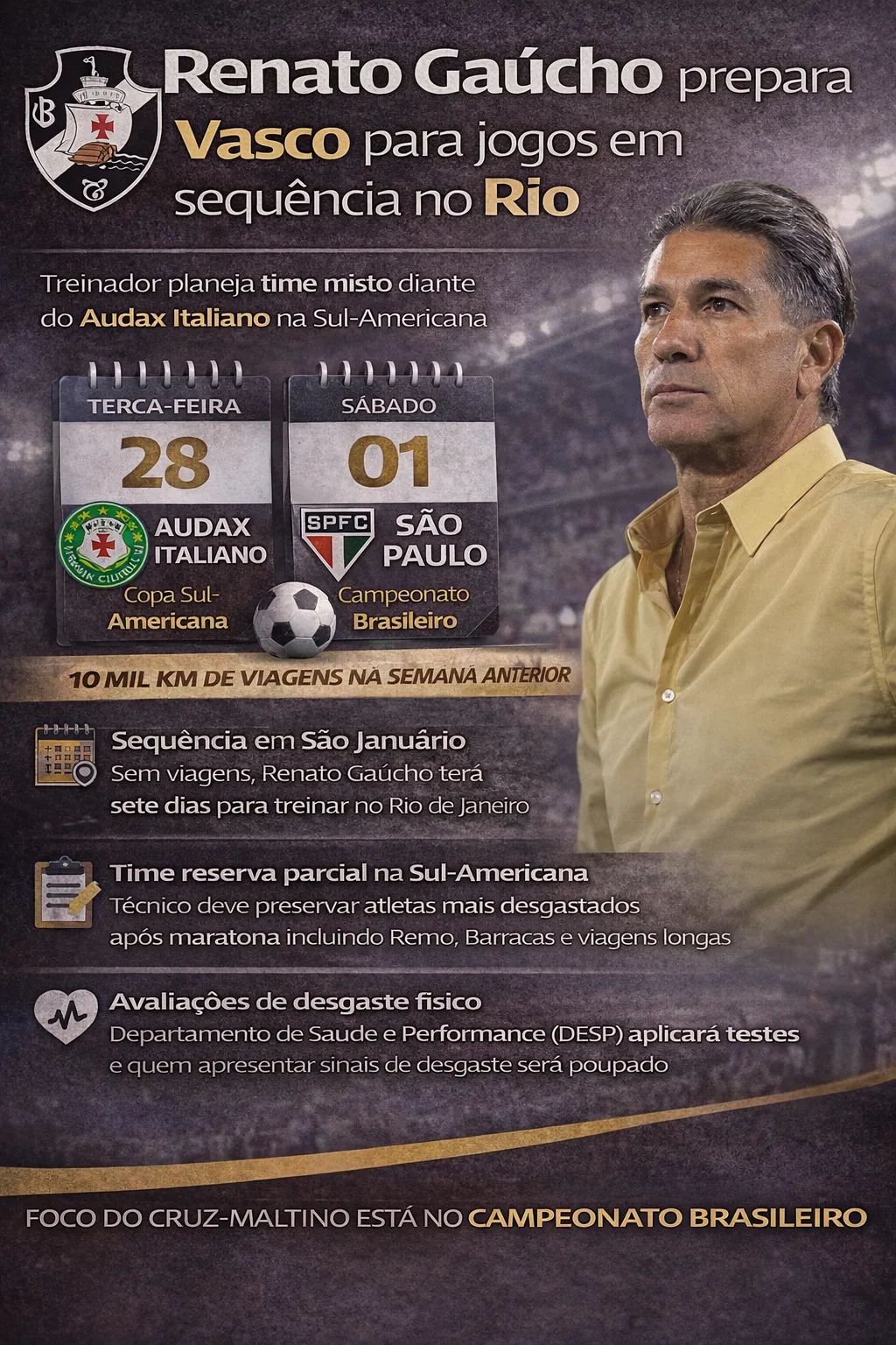 Na semana anterior, o CRVG enfrentou o Barracas Central e Renato optou por ficar no Rio de Janeiro com os principais jogadores para não perder dias de treinamento. Ele destacou que poupar uma equipe não resolve todos os problemas em poucos dias e criticou a ideia de que uma simples pausa poderia garantir um desempenho perfeito em um próximo jogo.