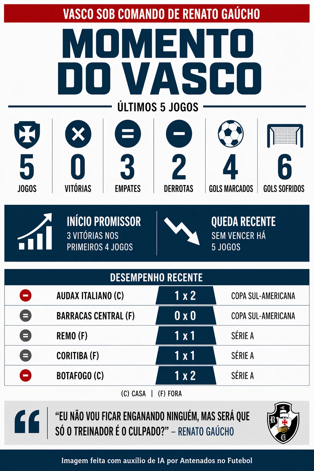O início de Renato no comando do Vasco foi avassalador, com o time chegando a emendar três vitórias nos seus primeiros quatro jogos. No entanto, o rendimento do Cruzmaltino caiu nas últimas partidas.