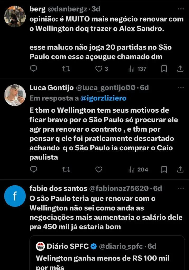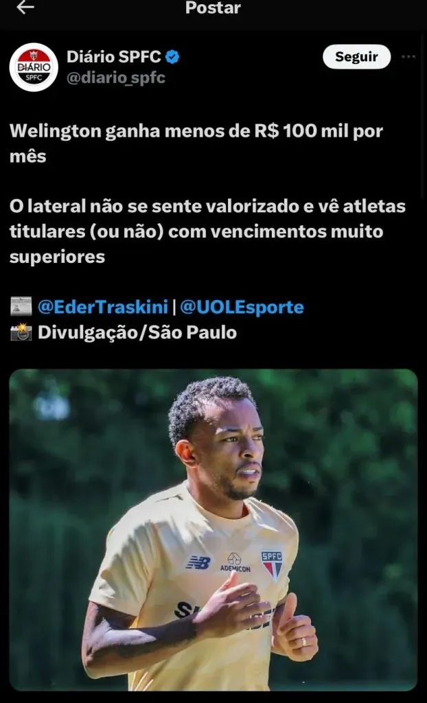 “Essa situação só chegou nesse ponto por incompetência da diretoria do São Paulo em relação à renovação. O Welington era capitão do sub-20, aí subiu. Quando o Reinaldo deu sinais de que não daria [para continuar], ali era o momento de renovação. Perdeu o primeiro momento. Segundo momento: o Welington quebra a perna contra o Água Santa e fica no campo. Também não renovou. Agora, o empresário está com a faca e o queijo na mão”, disse Arnaldo Ribeiro durante a Live do São Paulo através do UOL.