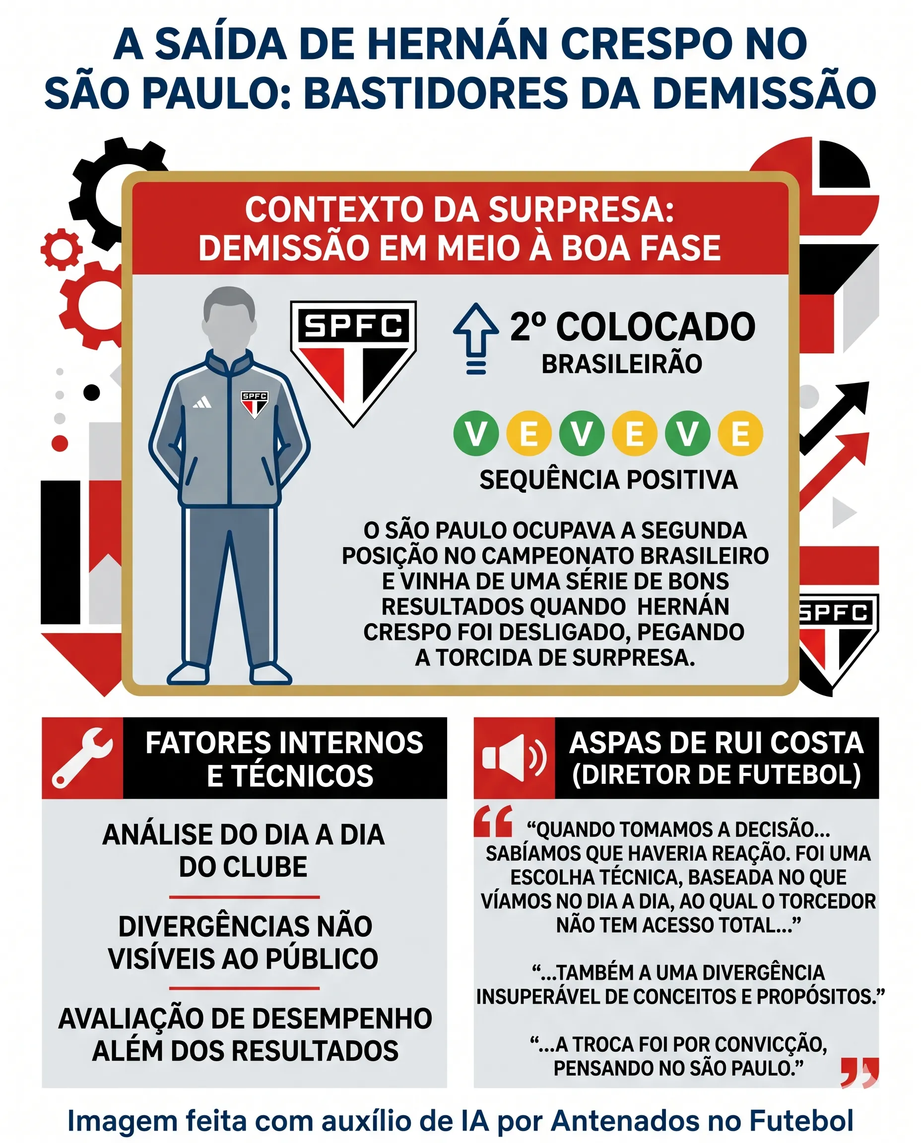 A saída de Hernán Crespo levanta questionamentos sobre o planejamento do São Paulo. O treinador apresentava resultados positivos e mantinha a equipe em posição de destaque na competição. A decisão, baseada em divergências internas, pode ser interpretada como precipitada diante do desempenho em campo. Além disso, a mudança tende a aumentar a pressão sobre o clube, que já enfrenta um ambiente de cobrança.