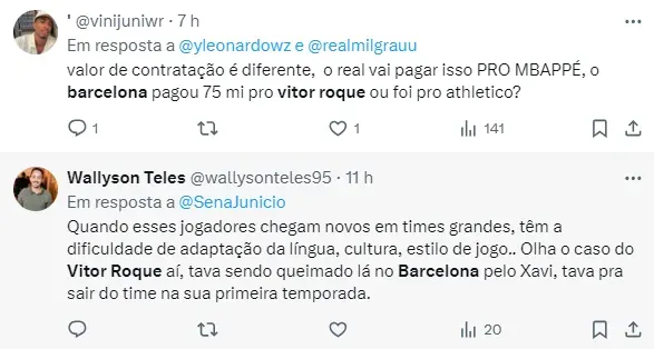 Além disso, o mandatário também declarou que o Barcelona pretende negociar alguns jogadores, mas ele não deixou claro que Vítor Roque estará nessa relação. “Há jogadores que pediram para sair ou serem emprestados. Deco [diretor] e Flick irão decidir, está nas mãos deles”, afirmou.