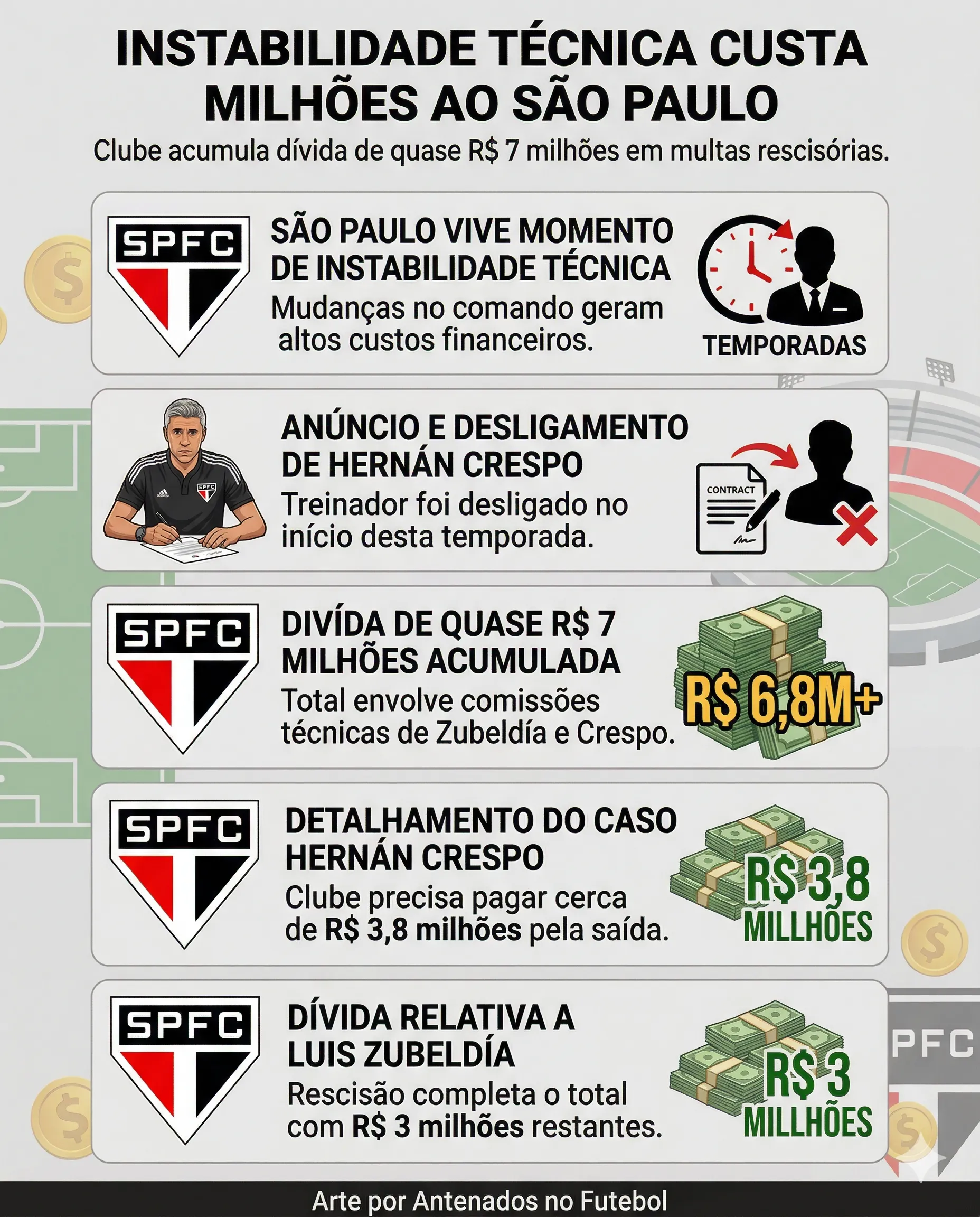 Segundo as informações reveladas pelo jornalista Valentin Furlan, do UOL, o São Paulo acumulou uma dívida de quase R$ 7 milhões em multas rescisórias relacionadas às saídas das duas comissões técnicas.