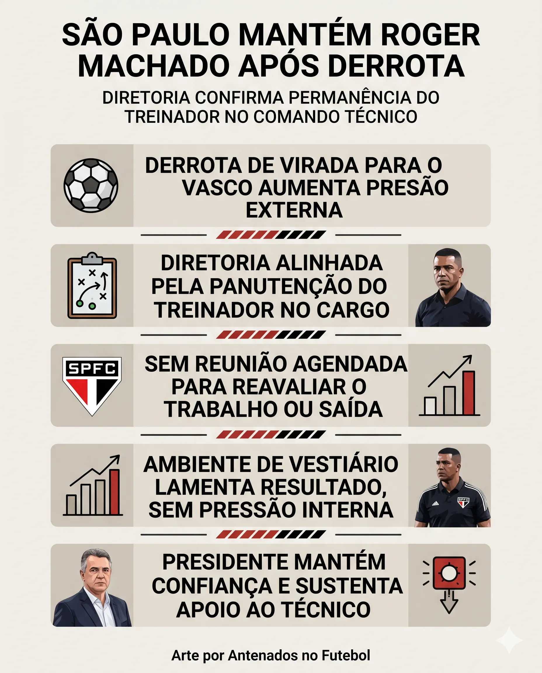 Apesar do resultado, a diretoria já tomou uma decisão sobre o futuro do treinador no clube. Segundo informações do Globo Esporte, a presidência e a diretoria de futebol do São Paulo estão alinhadas pela permanência de Roger Machado, mesmo após a derrota.