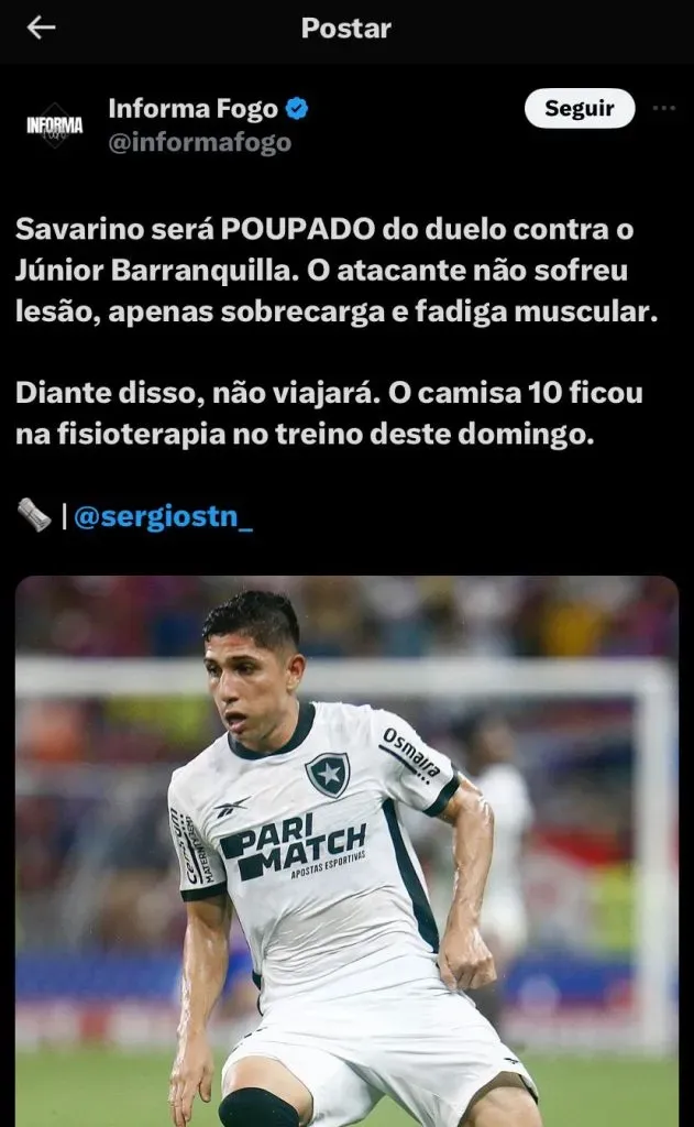 Lembrando que não há uma lesão séria confirmada para Savarino, apenas fadiga muscular. Por isso, a comissão técnica optou por não forçar o camisa 10 e poupá-lo nos próximos compromissos.
