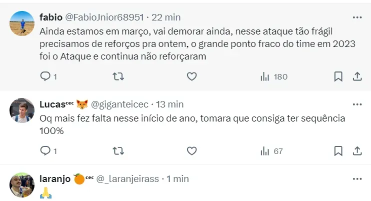 A princípio, a expectativa é que o jogador vire uma opção para Larcamón ainda em abril. A ideia é que comece a ser utilizado entre o início do Campeonato Brasileiro e a fase de grupos da Sul-Americana.