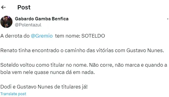 Após uma partida de pouco brilho do baixinho, os torcedores não pouparam o atacante e os seguintes comentários contra a atuação do velocista estão bombando nas redes sociais do Tricolor Gaúcho (SIC). “Esse aí está devendo demais, tem que comer um banco”.