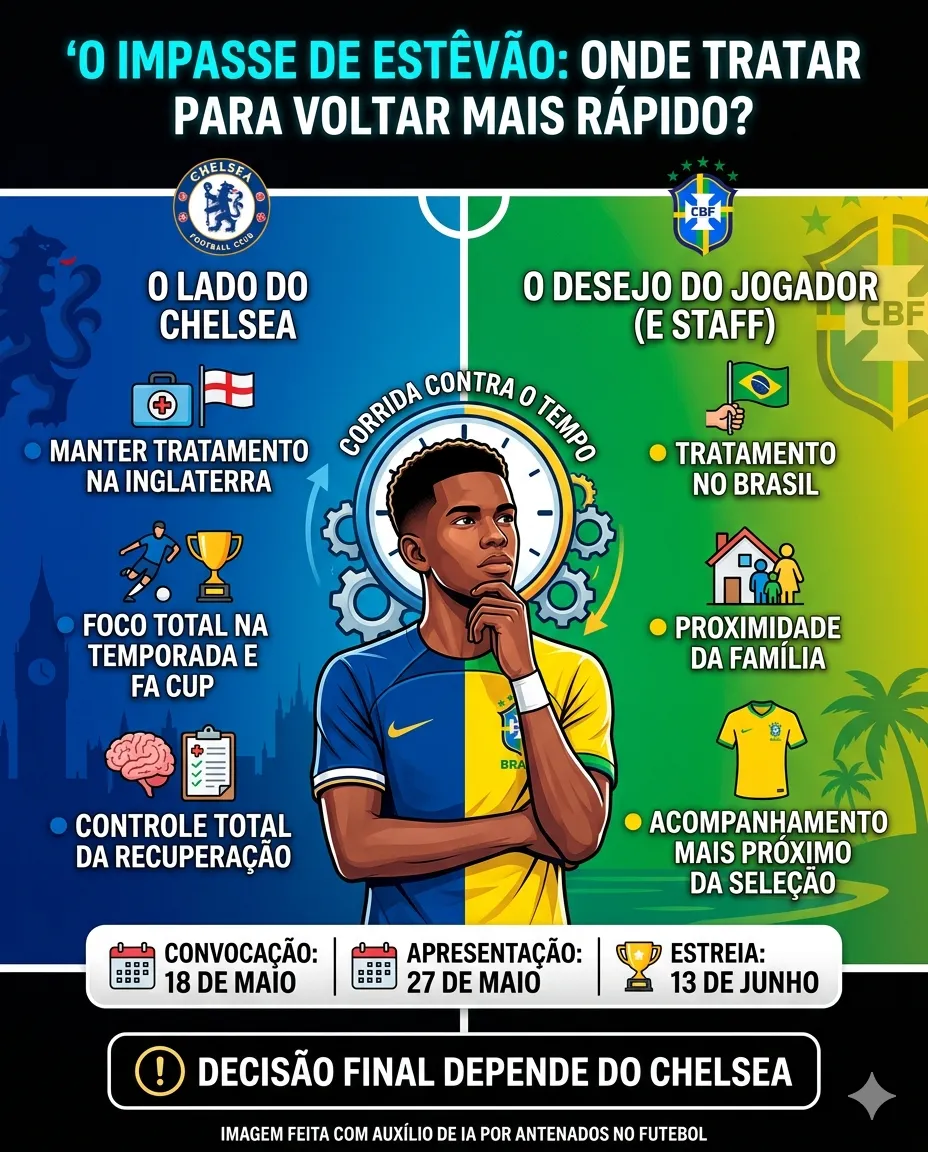 A indefinição não é apenas uma questão médica, mas também estratégica para o futuro de Estêvão. A escolha do local de recuperação pode influenciar diretamente no tempo de retorno e, consequentemente, nas chances reais de disputar a Copa do Mundo.