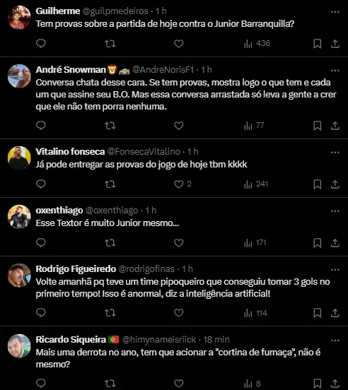 O empresário chegou ao Estádio Nilton Santos com o jogo já em andamento e não presenciou os três gols do Junior Barranquilla no primeiro tempo. Após a vitória do time colombiano por 3 a 1, Textor criticou a estreia do Botafogo na fase de grupos da Libertadores, classificando a performance do time como “patética”. “Foi uma performance patética do time hoje. Nossos capitães sabem. Temos um novo treinador chegando. Abrimos uma competição maravilhosa, com uma performance horrorosa”, lamentou Textor.
