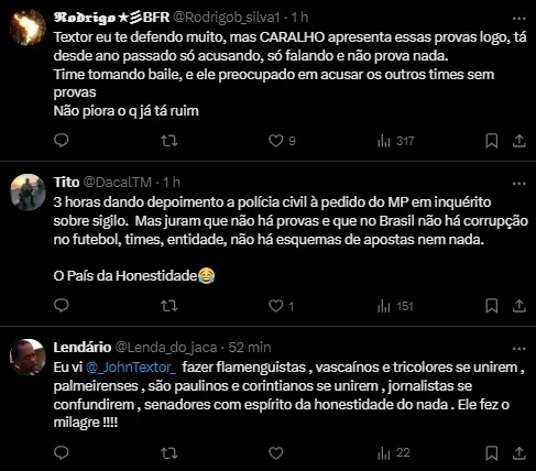 Textor explicou que iniciou um processo na delegacia, entregou provas e prestou depoimento. Ele afirmou ter mais provas do que um simples relatório da Good Game!, uma empresa francesa contratada por ele para analisar jogos do Brasileirão.