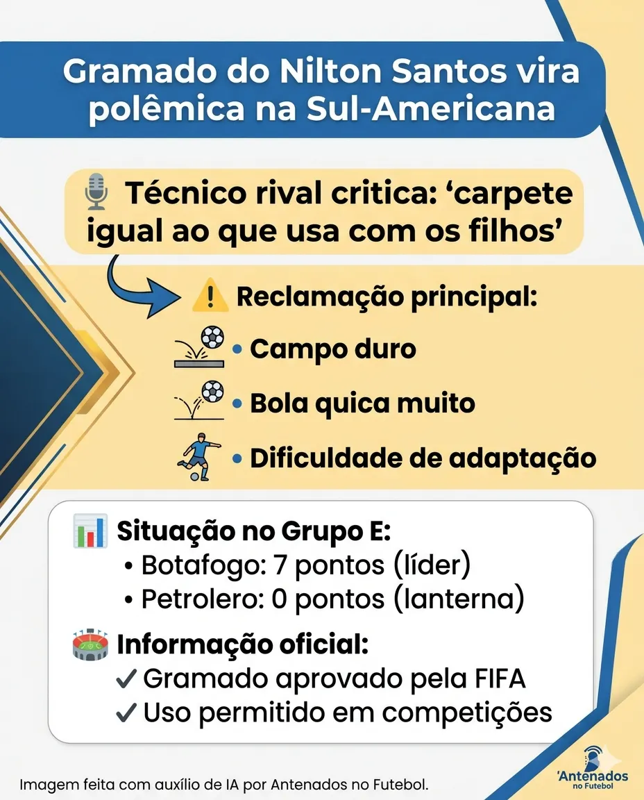 A vitória do Botafogo na Copa Sul-Americana, nesta terça-feira (28), construída com autoridade dentro de casa, acabou acompanhada por uma polêmica fora das quatro linhas. O técnico do Independiente Petrolero, Thiago Leitão, direcionou críticas ao gramado do Estádio Nilton Santos após o confronto.