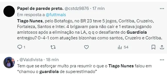 Tiago Nunes que, comandou o Glorioso da última temporada até o começo de 2024 e atualmente está no Universidad Catolica, concedeu uma entrevista à ESPN do Chile. Contudo, o treinador surpreendeu durante o bate-papo ao cutucar Guardiola e a Premier League.