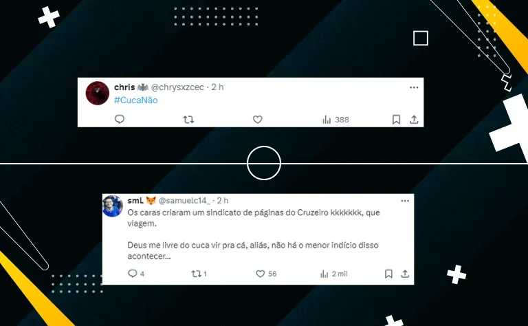“O grupo “Páginas do Cruzeiro“, vem através deste, informar que é totalmente contra a possível vinda do técnico Cuca, ao qual temos como consenso, ser um grande desrespeito a história centenária do Cruzeiro E.C., convidamos a todos a levantar a #CucaNão. Não é não! E a torcida do Cruzeiro diz não”, postou o perfil Blog da Raposa no X (antigo Twitter).
