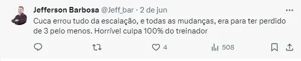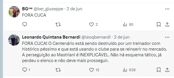 “Cuca errou tudo da escalação, e todas as mudanças, era para ter perdido de 3 pelo menos. Horrível culpa 100% do treinador”, disse um torcedor. “FORA CUCA! O Centenário está sendo destruído por um treinador com histórico péssimo e que está usando o clube para se reinserir no mercado. A perseguição ao Mastriani é INEXPLICÁVEL”, disse outro.