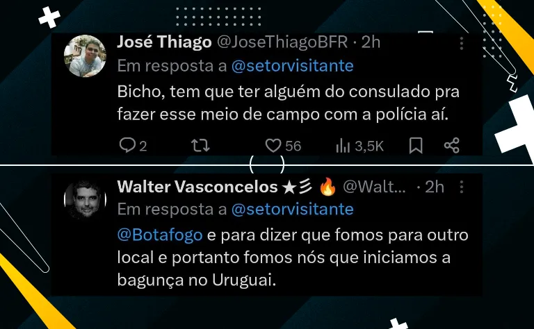 “A polícia marcou o ponto de encontro da torcida do Botafogo em um parque. Acontece que tem dois parques com o mesmo nome. Agora os policiais que estão no parque A mandam ir para o B e os que estão no B mandam ir para o A. Fazem isso de sacanagem para tumultuar nossa ida ao estádio”, afirmou o torcedor no X.