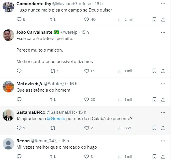 “Hugo nunca mais pisa em campo se Deus quiser”, disse um torcedor. “Esse cara é o lateral perfeito. Parece muito o Maicon. Melhor contratação possível que fizemos”, comentou outro usuário. “Mil vezes melhor que o mercado do Hugo”, analisou outro torcedor.