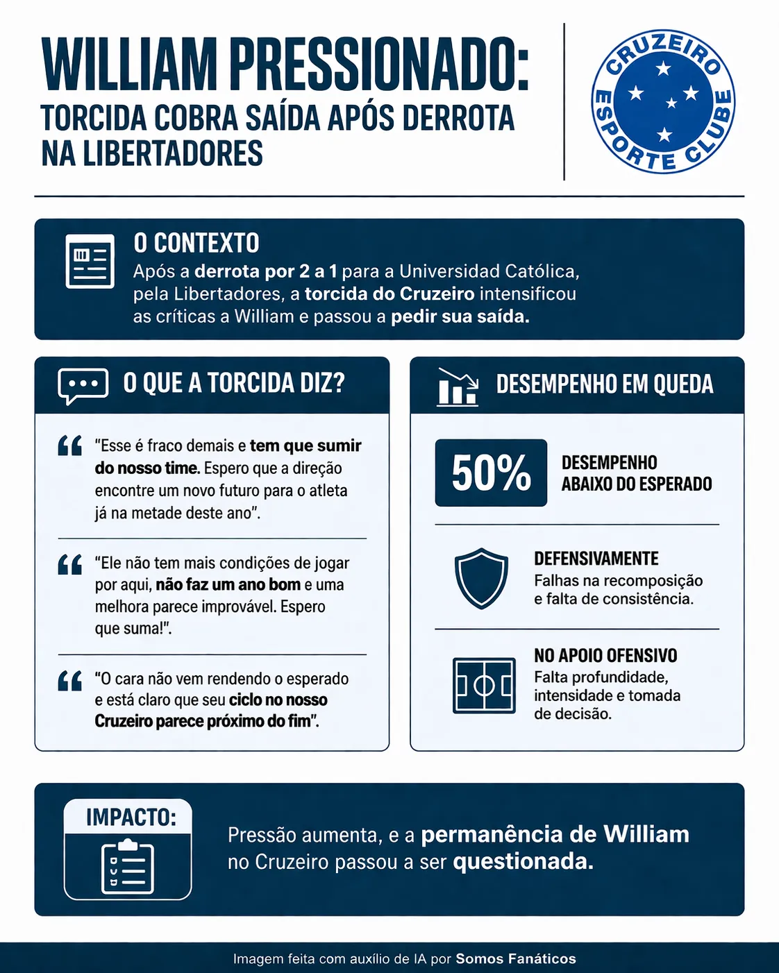 Nesta manhã de quinta-feira (16), o assunto no Cruzeiro segue sendo o revés pra a Universidad Católica por 2 a 1. Sobre o tema, nas últimas horas, a torcida celeste tratou de rasgar o verbo contra William e pedem até sua saída do clube.