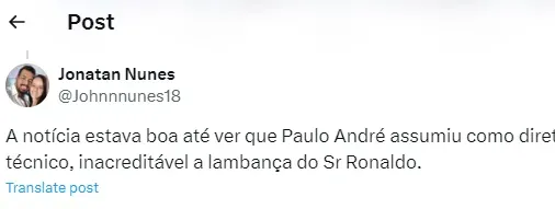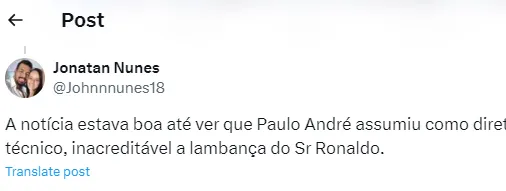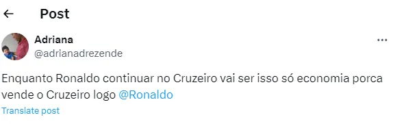 “Esse Ronaldo está de sacanagem, tem que largar a mão de fazer basteira e sair do nosso time”. “Ele só fez coisa errada desde que assumiu o comando do Zerão, espero que venda a SAF!”. “O cara é brincalhão, está tirando com a cara do torcedor”.
