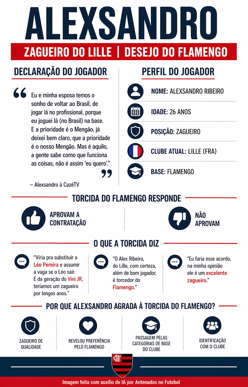 A declaração de Alexsandro naturalmente empolga a torcida do Flamengo, mas esse não pode ser o fator decisivo em uma eventual contratação. O zagueiro do Lille tem qualidade e é identificado com o clube, o que pesa positivamente. Porém, a diretoria precisa avaliar custo, momento técnico e planejamento do elenco antes de agir no mercado.