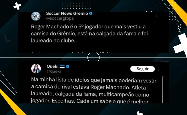 (SIC) “Roger Machado é o 5º jogador que mais vestiu a camisa do Grêmio, está na calçada da fama e foi laureado no clube. As homenagens (minha opinião) tem que ser revista pelo conselho e que as portas passem a ser fechadas para esse cidadão”, disse; “Na minha lista de ídolos que jamais poderiam vestir a camisa do rival estava Roger Machado. Atleta laureado, calçada da fama, multicampeão como jogador. Escolhas. Cada um sabe o que é melhor pra si. Só posso lamentar”, disse outra torcedora.